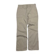 フロントは大きめのベイカーパンツによく似たパッチポケット、バックはフラップ付きで、両端の角が落とされたカットコーナーフラップの2ポケット仕様と、ワークパンツらしい武骨なディテールが特徴です。